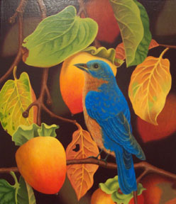 "Bluebird & Persimmons" (SOLD) acrylic on panel, 8" x 9.25" |