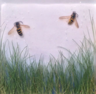 "Buzz" (SOLD) acrylic, ink, resin, grass & bees on wood, 3.5"x 3.5" |