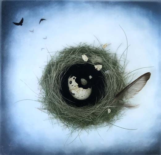 acrylic, ink, resin, grass, and egg on wood, 7" x 7"