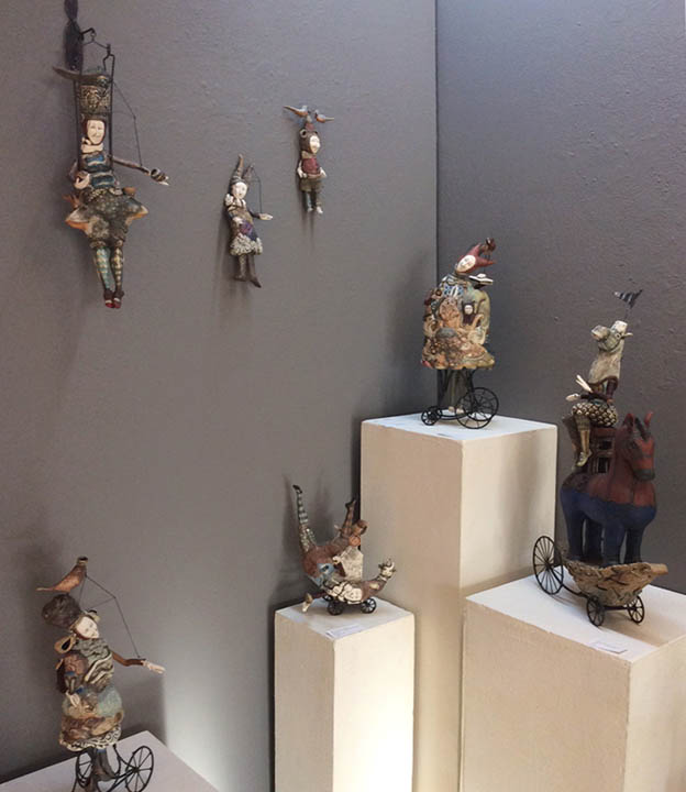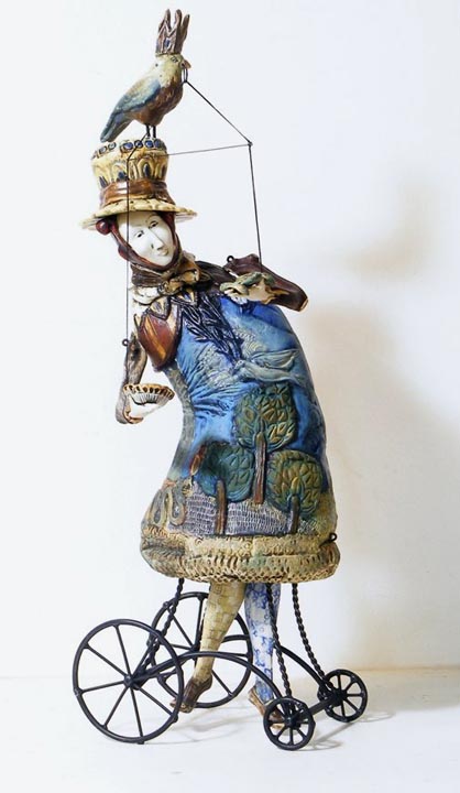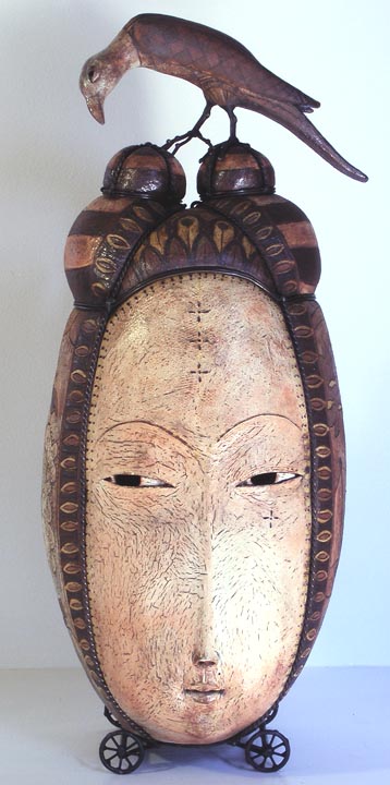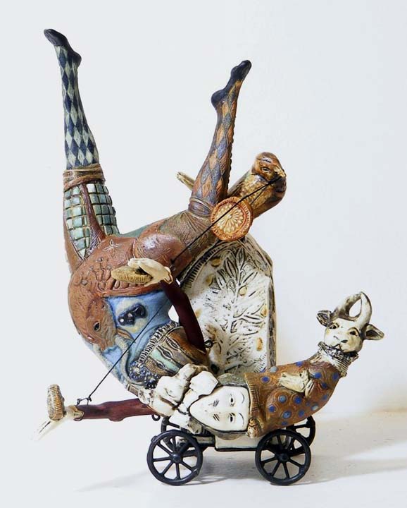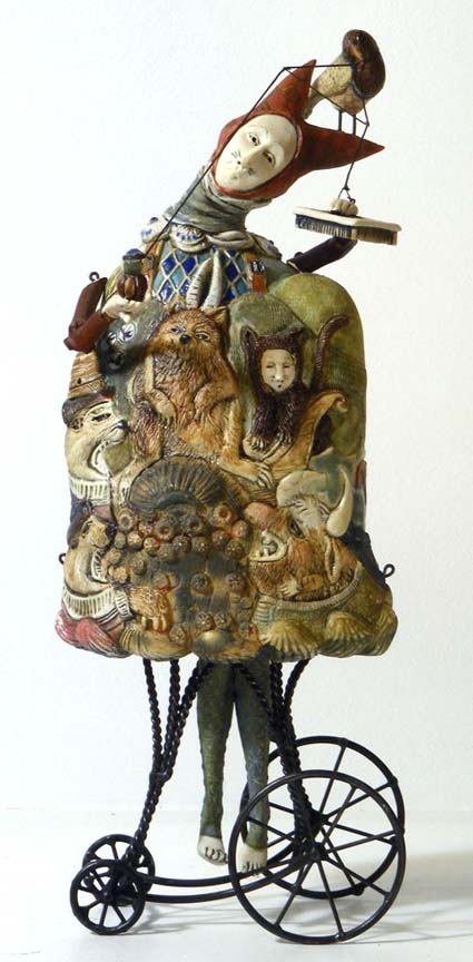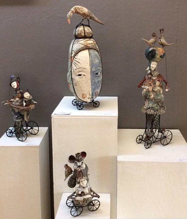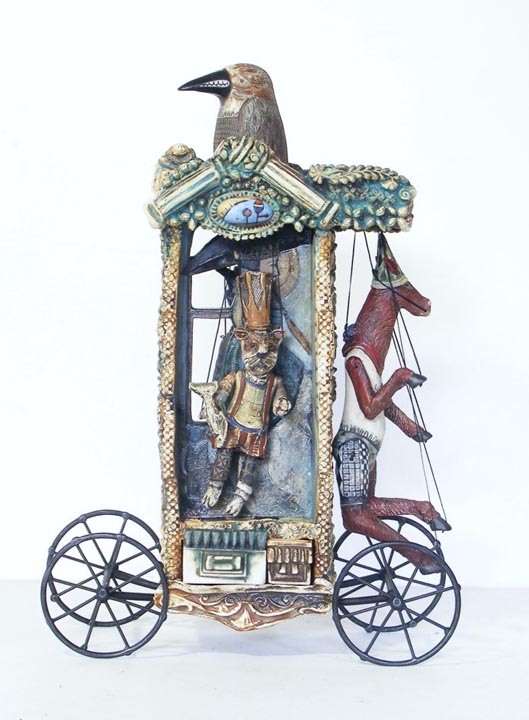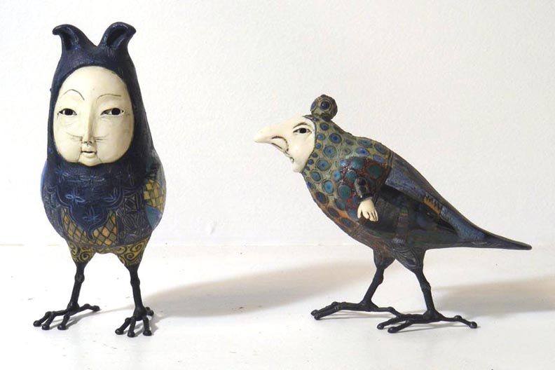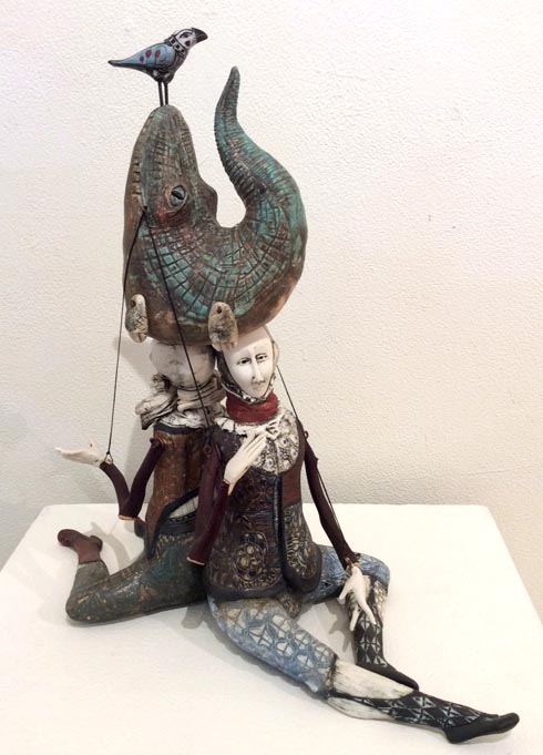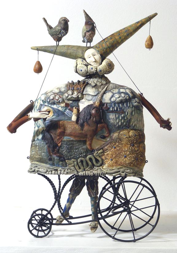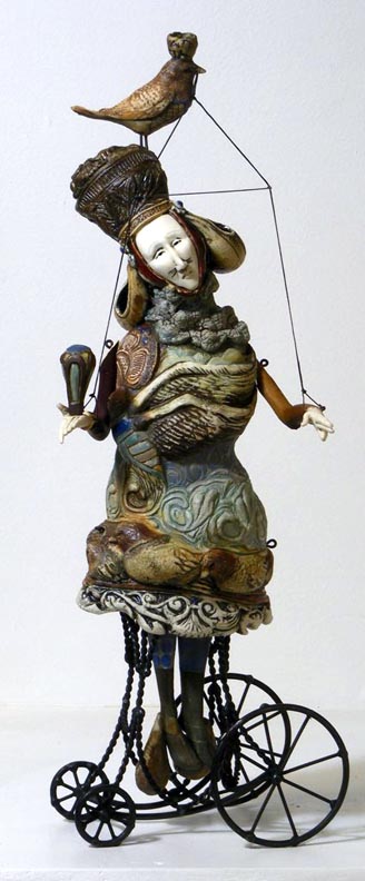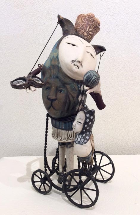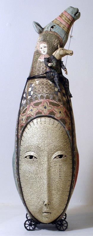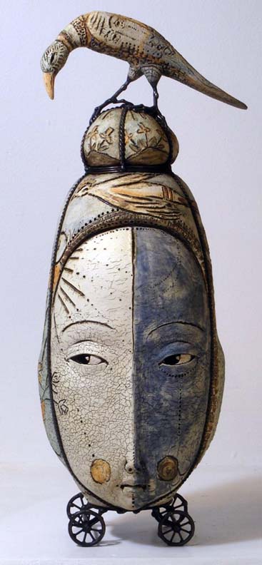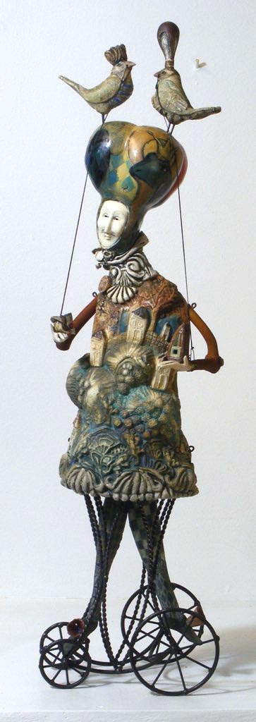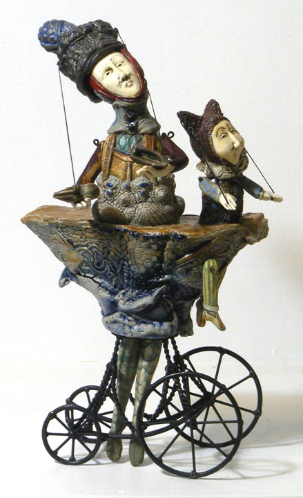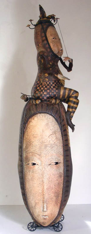 Robin and John Gumaelius combine steel, ceramic and wood to create animated human and bird-like sculptures. The highly detailed works incorporate imagery of plants and animals, houses, boats, wheels, masks and other symbolic motifs that reflect on the journeys of traveling through life. The husband and wife team work together on each piece. Their artworks that reveal intricate stories fathomed by a creative couple and told through of a singular vision of their world. |