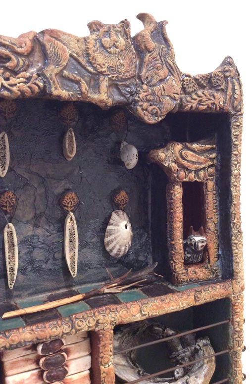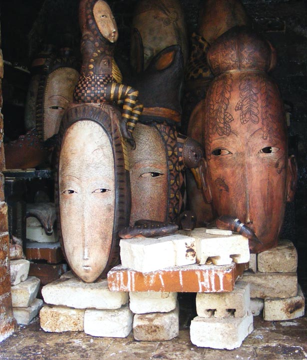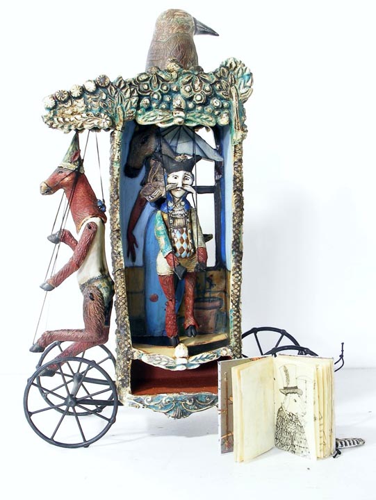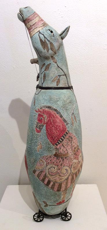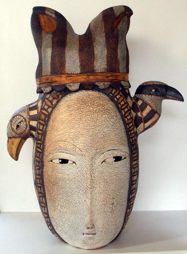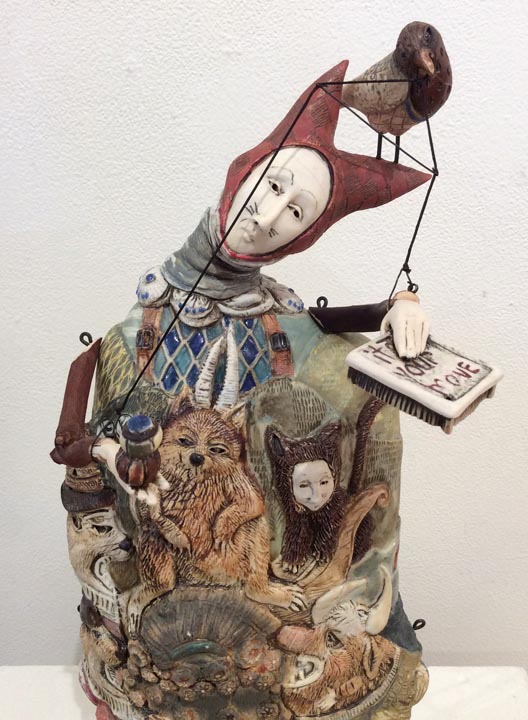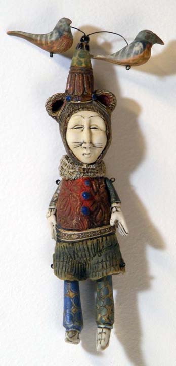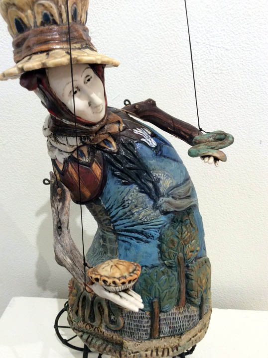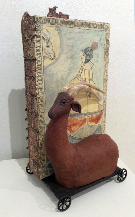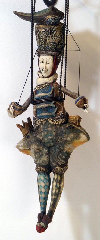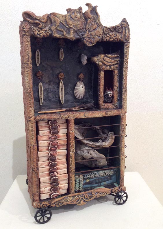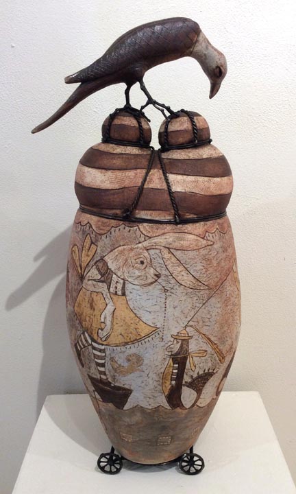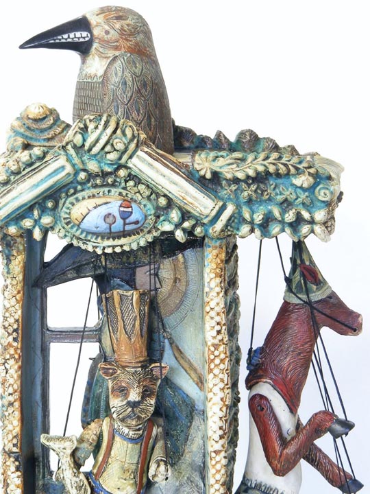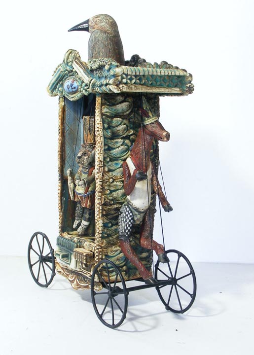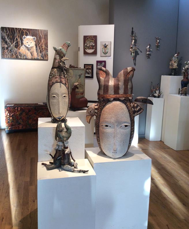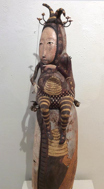 Robin and John Gumaelius combine steel, ceramic and wood to create animated human and bird-like sculptures. The highly detailed works incorporate imagery of plants and animals, houses, boats, wheels, masks and other symbolic motifs that reflect on the journeys of traveling through life. The husband and wife team work together on each piece. Their artworks that reveal intricate stories fathomed by a creative couple and told through of a singular vision of their world. |