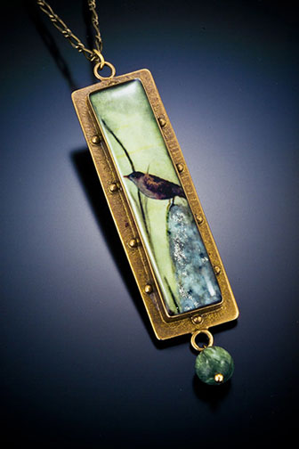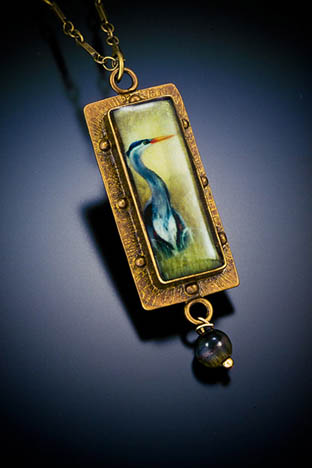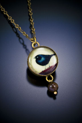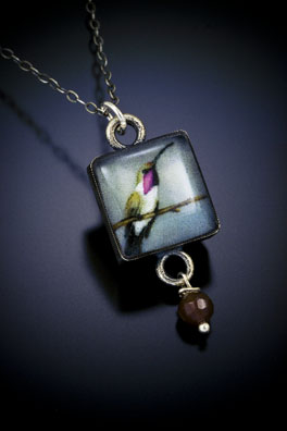 Northwest painter and renowned cellist Lori Presthus creates egg tempera and pastel works of art depicting flora and fauna. As an avid bird watcher, her special devotion to birds especially shines forth as she captures their unique beauty and personalities. From each original painting comes the art jewelry. A giclee print is hand-colored with color pencils and pastels, set in either sterling silver, bronze, or hand-dipped gold and pewter bezels, and encased in resin by Northwest mixed-media artist Julia Gardner. Each piece of jewelry is truly a miniature work of art! |