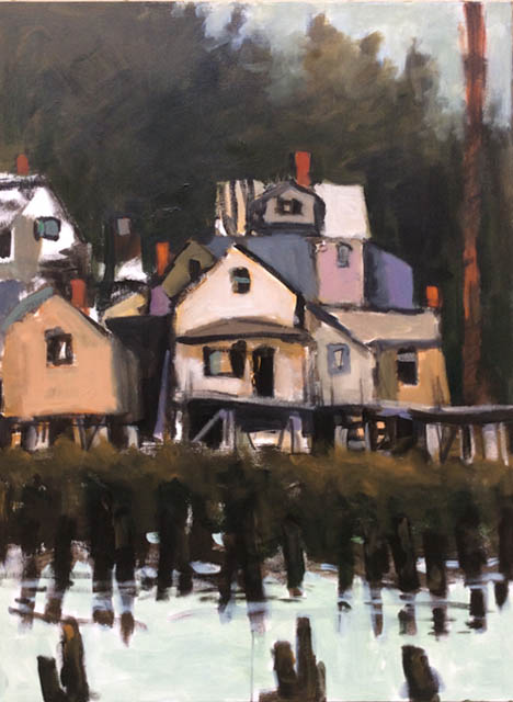 Snow, sleet, hail and finally rain as I wind down the steep streets of Astoria from the Column to the Safeway on the banks of the Columbia River. Creating a narrative with place is the foundation for much of my work and for the past several years the far northwest corner of Oregon has been an ongoing story. In the middle of the Young’s Bay Bridge, I pull into a small turnout and sketch the shapes of structures on the steep hillside facing the bay. This particular sketch has evolved into a series of paintings that provide a portrait of a community in transition. As the freighters turn with the tide, new breweries emerge. Gray clouds continue to moderate the intensity of light and dark. R. Schlegel - Spring 2019 |