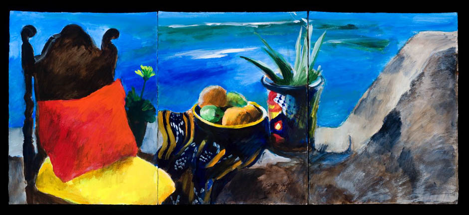 "Vida Bay: Chair with Yellow Cushion" acrylic on paper, 30" x 69"