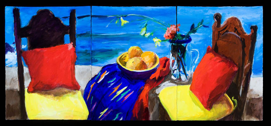 "Vida Bay: Two Chairs with Yellow Cushions" acrylic on paper, 30" x 69"