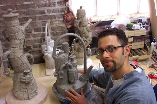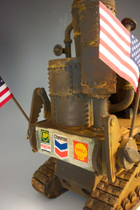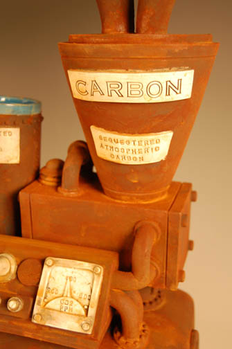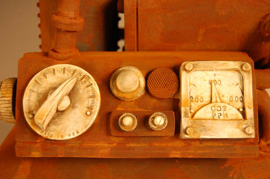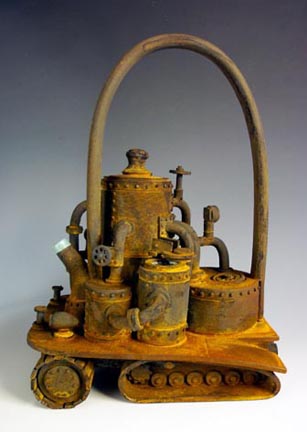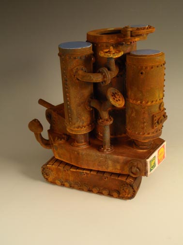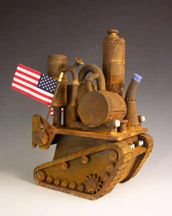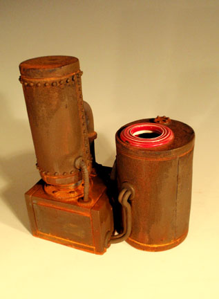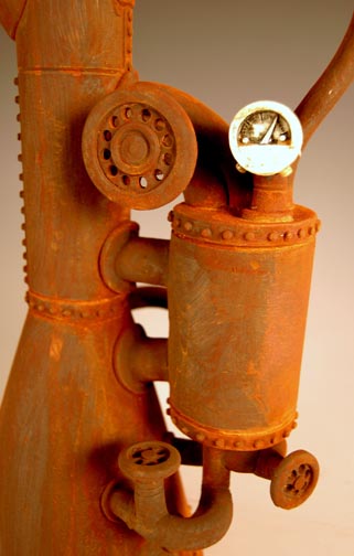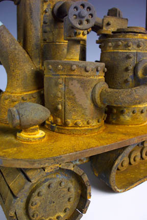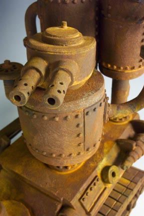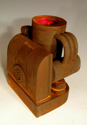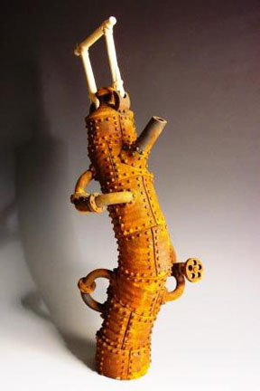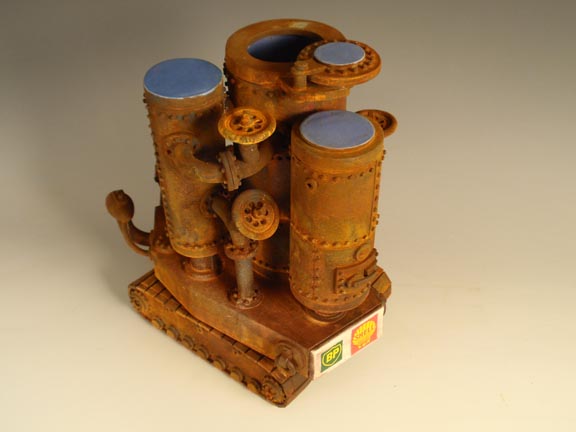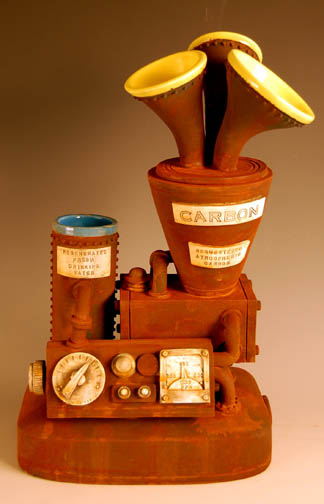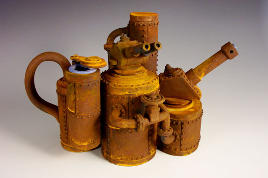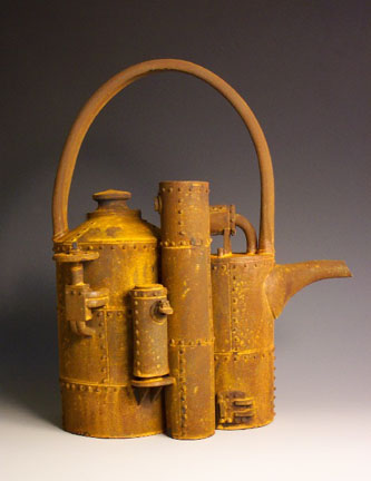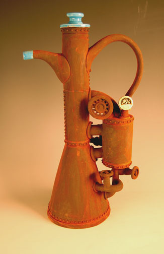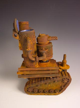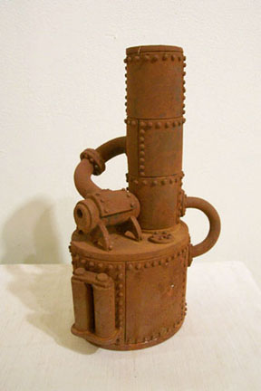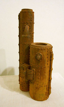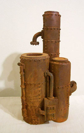 Constructed entirely of clay, these pieces of art are totems and mementos of a time and industry which will soon have gone by. They also reflect the militaristic means needed to secure our interests and perceived requirements for energy derived from fossil fuel. The interiors are traditionally glazed and are water-tight, the exteriors are coated in an iron patina. After application, my work is placed in the Northwest rain for a few months which causes the authentic rust to form on their exterior surface. - Randolph Silver |