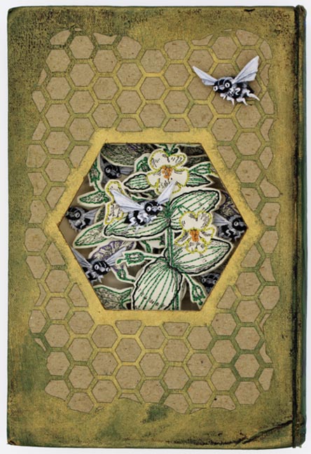 altered book, watercolor, acryla gouache, acrylic, thread, glass beads